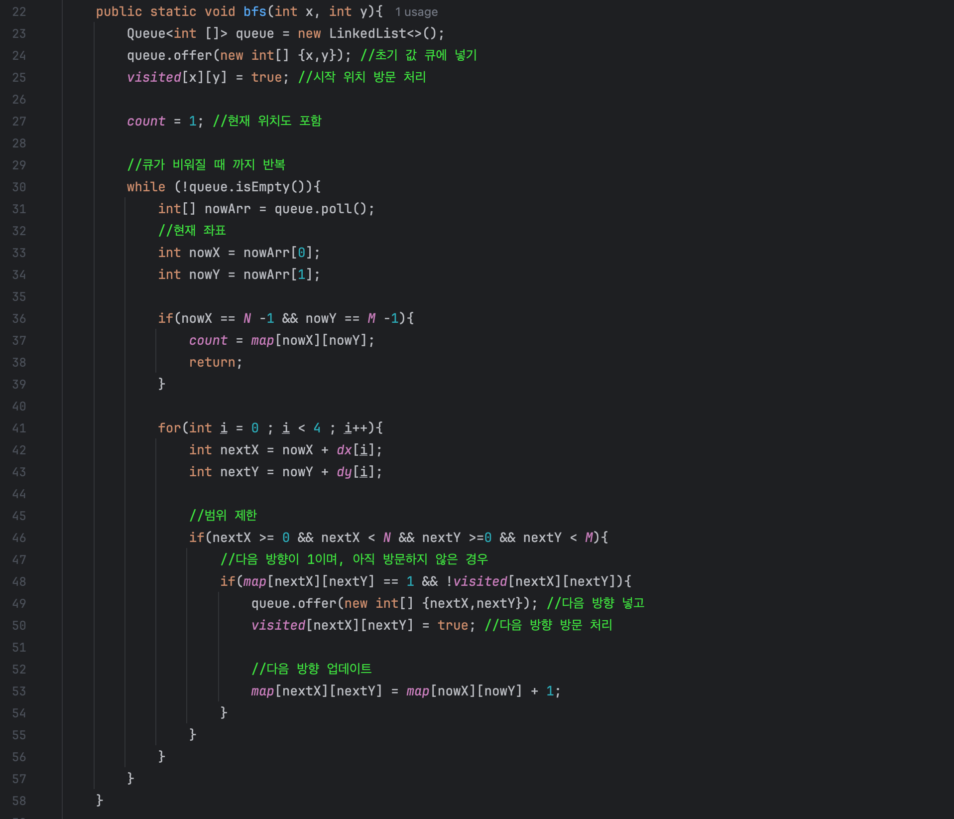 따라서 BFS를 수행하면서 이동 가능한 칸을 방문하고 그 칸까지의 거리를 이전 칸까지의 거리 + 1로 업데이트하여 저장하는 것이 핵심 로직입니다.