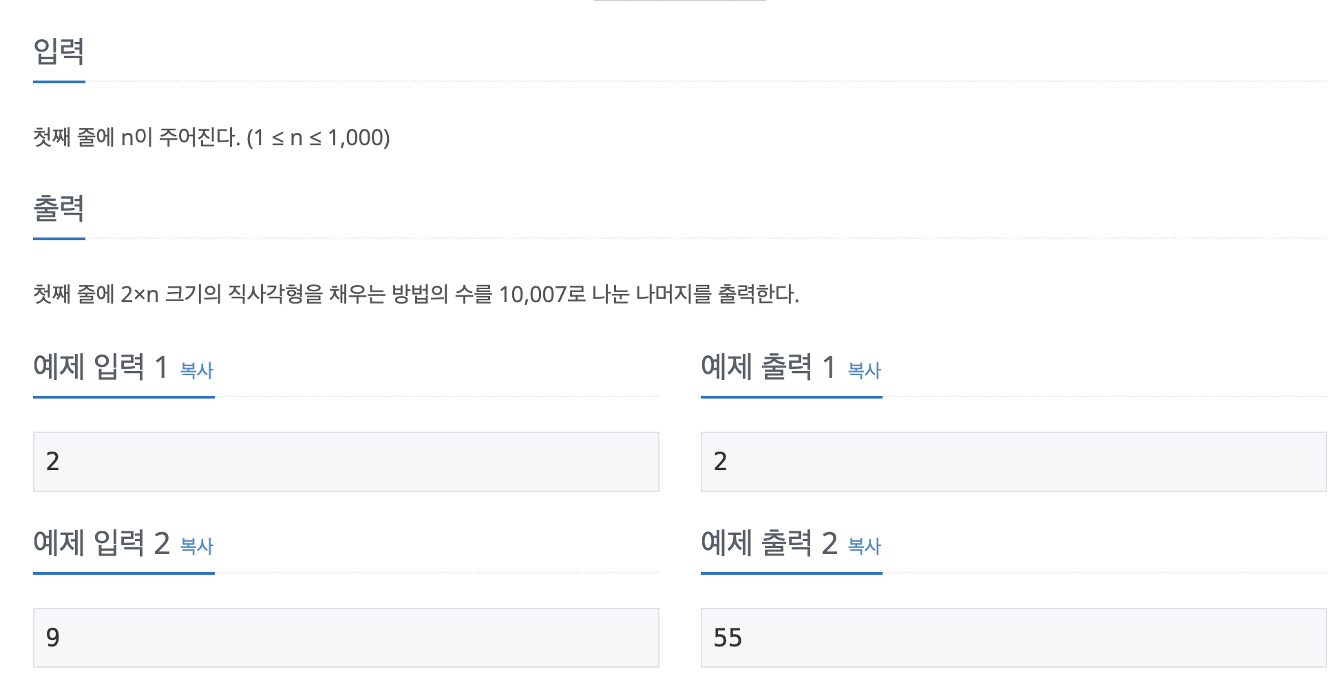 이번 문제는 가로는 2로 고정되어 있고 입력받은 N의 세로 크기만큼의 직사각형에 2x1, 1x2크기의 타일을 채워 넣을 수 있는 경우의 수를 구하는 문제입니다.