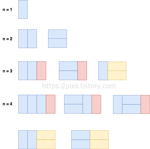 그림을 자세히 보면 n일 때는 n-1의 타일에 2x1타일이 추가된 것을 알 수 있고, n-2의 타일에 1x2의 타일이 2개 추가된 것을 알 수 있습니다.