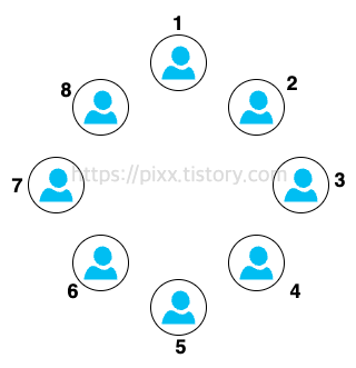 이해를 돕기위해 위 그림을 기준으로 예로 들자면 8명의 사람이 위와 같이 원형으로 앉아 있습니다.