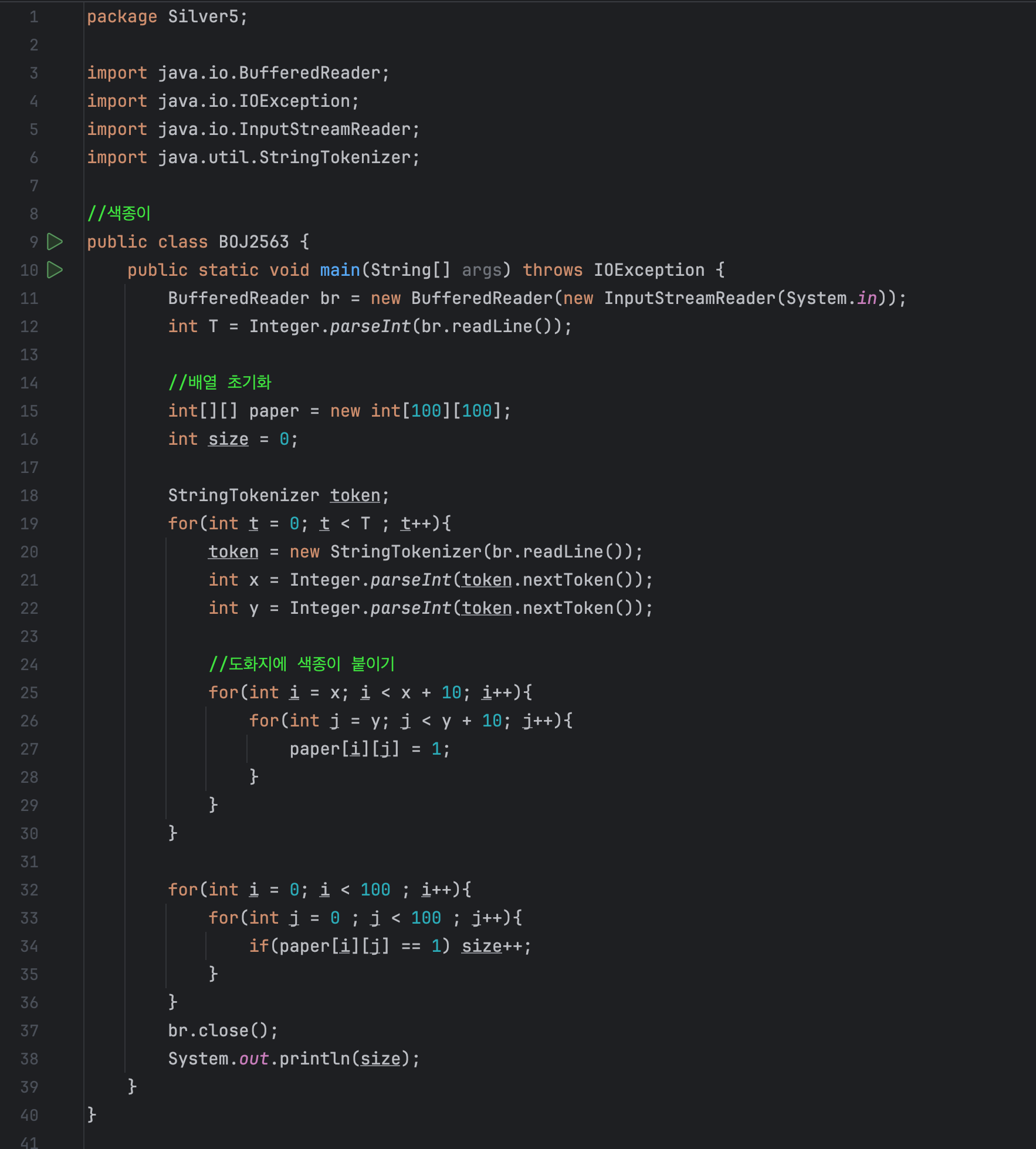 그리고 32번째 줄에서 도화지 전체를 순회하면서 1인 경우 즉 색종이가 붙여져 있는 경우 넓이를 증가시켜 주고, 이후에 넓이 size를 최종적으로 반환하여 넓이를 구해줍니다.