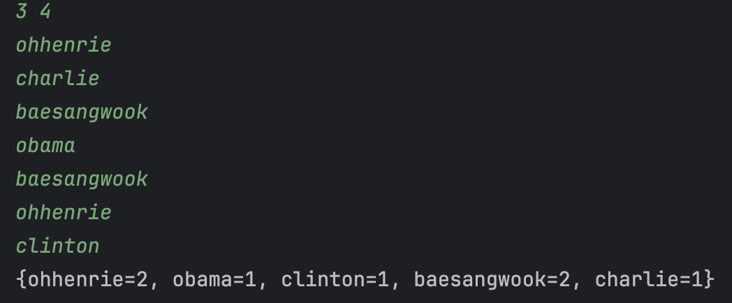 HashMap을 선언해 주고, N과 M을 입력을 받고, getOrDefault() 메서드를 사용하여 해당하는 이름을 1씩 증가했습니다.