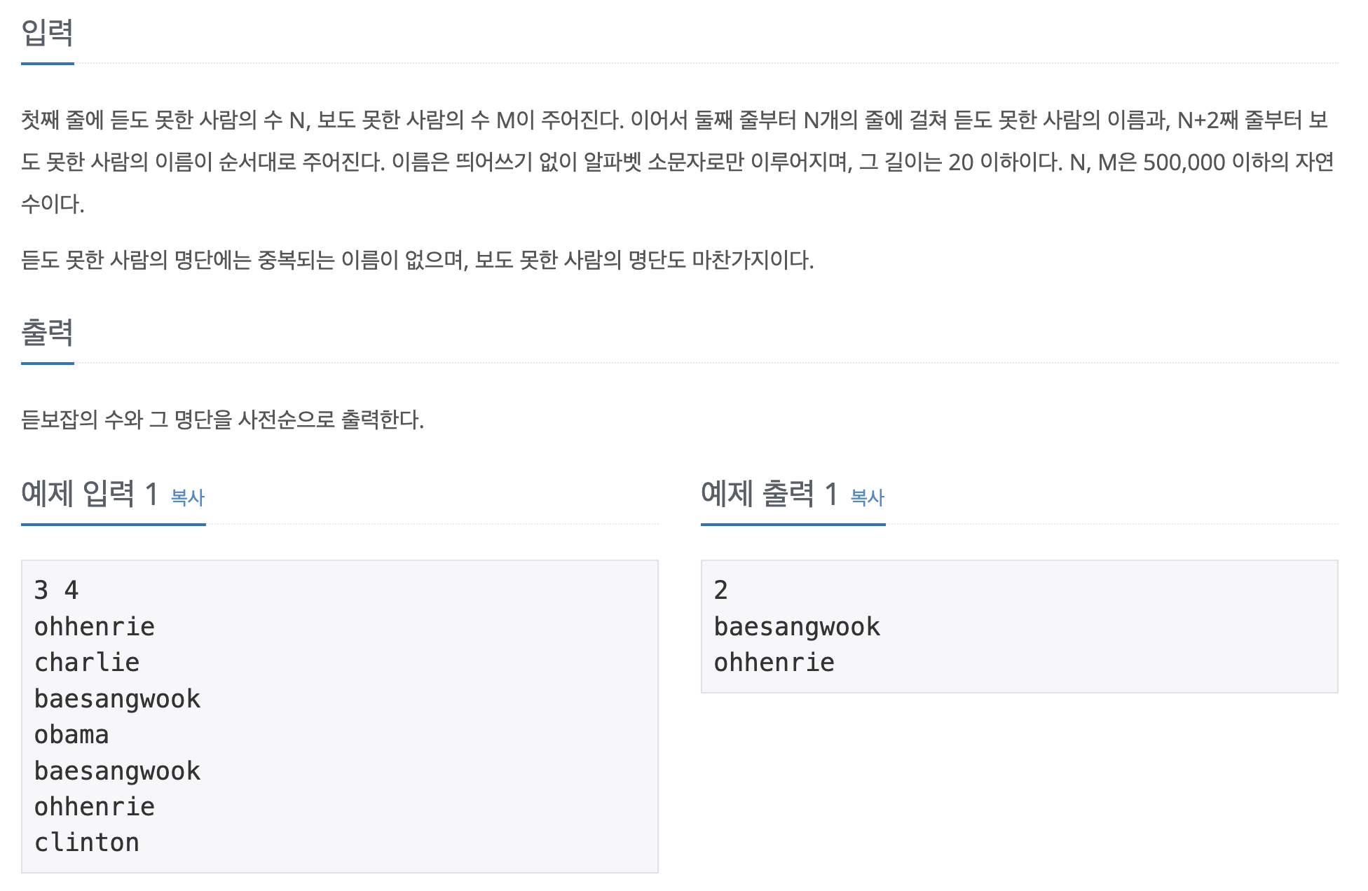 이번 문제는 듣도 못한 사람 N과 보도 못한 사람 M이 주어질 때 듣도 못한 사람 + 보도 못한 사람 = "듣도보도 못한 사람"을 구하는 문제입니다.