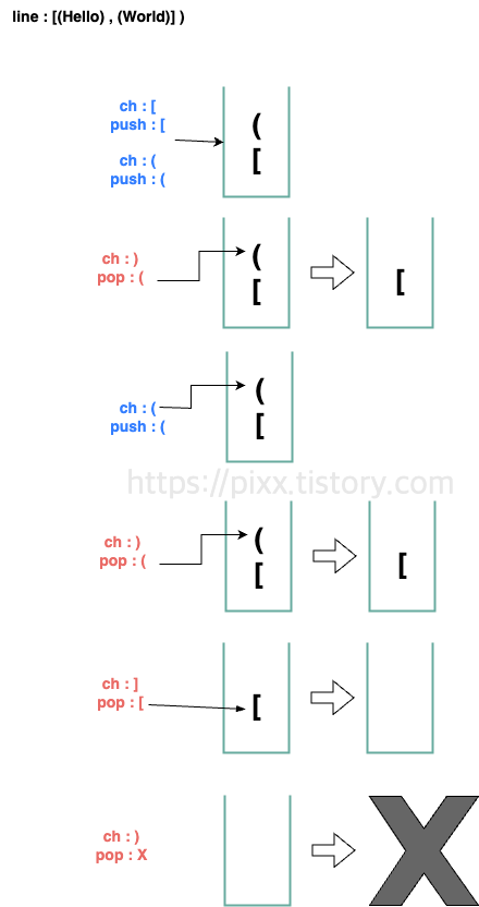 위 그림의 경우 문자열 "[(Hello) , (World)] )"에서 마지막 괄호 ')'가 isBalanced함수에서 조건문의 isEmpty() 메서드를 만족하여 그대로 false가 반환되게 됩니다.