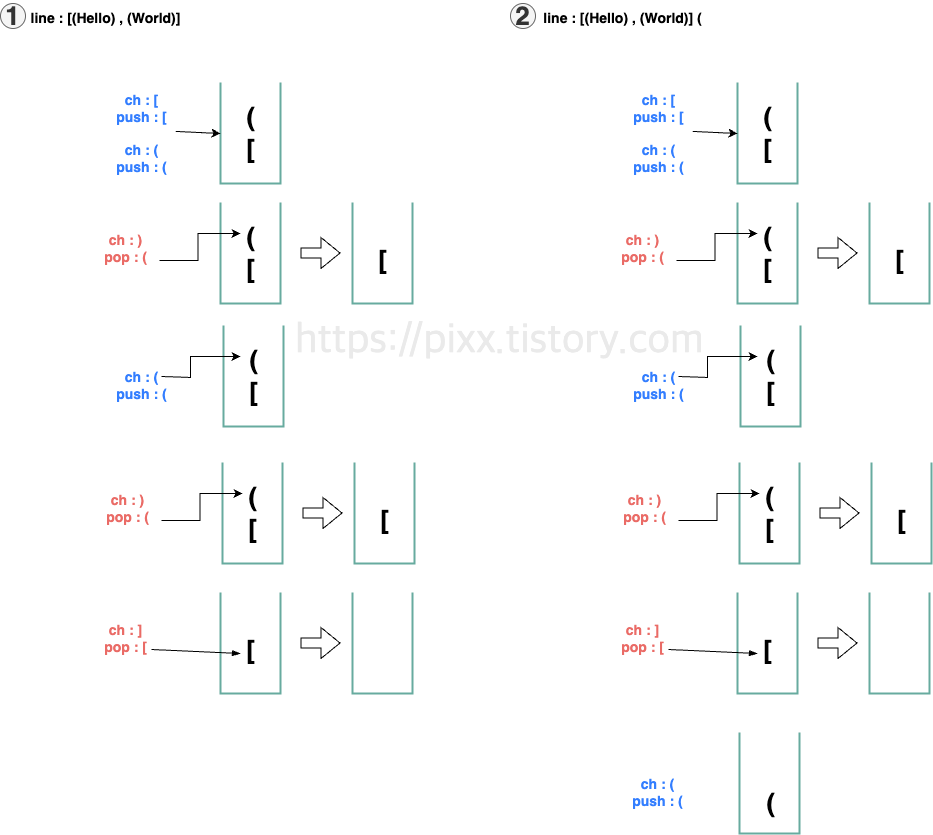 이해를 돕기 위해서 위 그림을 보면 1번 문자열 "[(Hello) , (World)]"은 모든 괄호가 스택에 push 되었다가 pop 되어서 결론적으로는 스택이 비어있어 균형을 이루는 문자열이 됩니다.