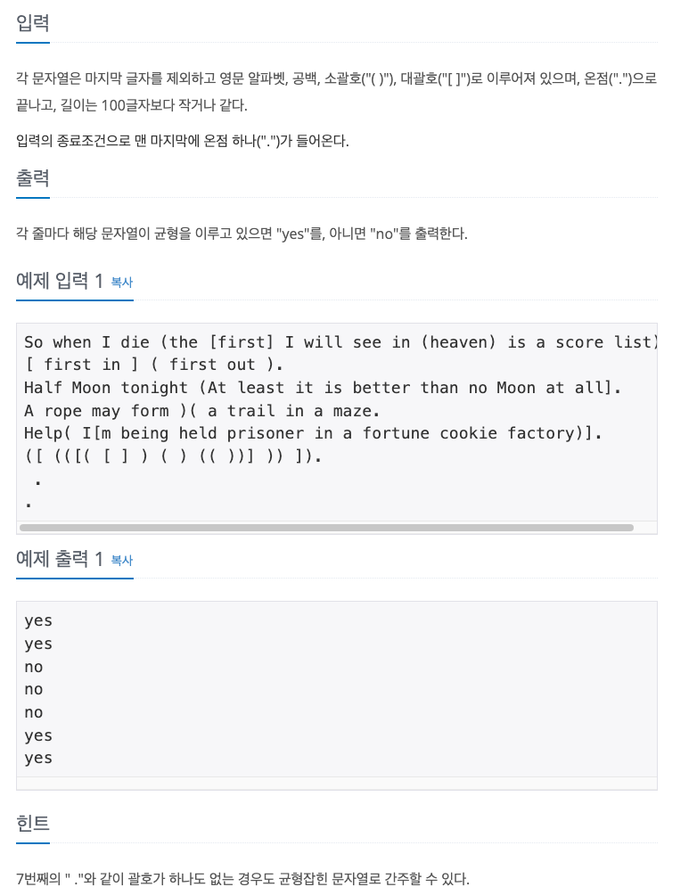 이번 문제는 문자열에서 괄호의 균형을 확인하는 것입니다. 주어진 문자열에 대하여 소괄호 ()와 대괄호 []가 올바르게 짝을 이루는지를 판단하고, 올바르면 "yes", 그렇지 않으면 "no"를 출력해야 합니다.