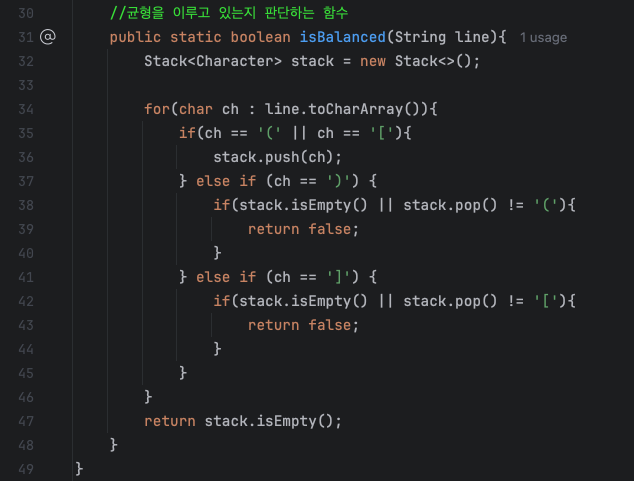 마지막으로 isEmpty() 메서드를 사용하여 균형을 이루고 있다면 스택은 비어있어야 하고, 각 라인을 전부 순회하고 나서도 스택에 요소가 존재한다면 균형을 이루지 못한 문자열이기 때문에 fasle가 반환되게 됩니다.