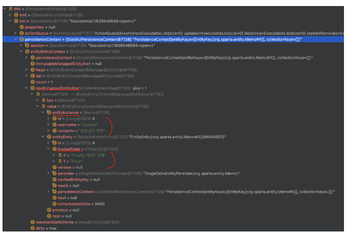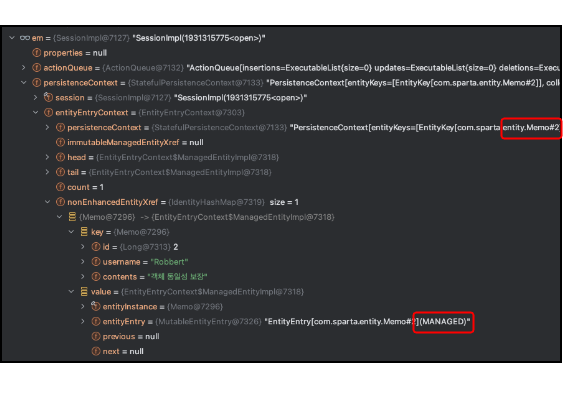 - memo.setUsername("Update")μ memo.setContents("λ³κ²½ κ°μ§ νμΈ") λ©μλλ₯Ό νΈμΆνμ¬ μν°ν°μ μνλ₯Ό λ³κ²½ν©λλ€. μ΄ μμ μμ μν°ν°μ μνλ Managed μνμμ λ³κ²½λμμΌλ©°, JPAλ μ΄ λ³κ²½ μ¬νμ κ°μ§ν©λλ€.