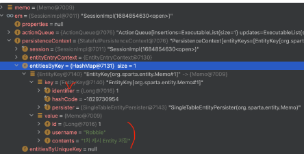 μ "μΊμ μ μ₯μ μ μ₯ κ²°κ³Ό"λ₯Ό 보면 em β‘οΈ persistenceContext β‘οΈ entitiesBykeyλ₯Ό νμΈν΄ 보면 key-value ννλ‘ μ λ³΄κ° μ μ₯λμ΄ μμμ νμΈν μ μμ΅λλ€.