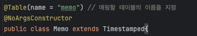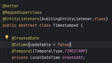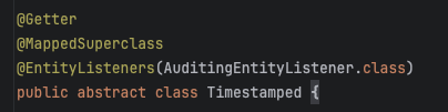 TimeStamp를 구현한 클래스를 Entity클래스로 사용하는 경우는 일반적이지 않습니다. 따라서 @abstract 즉 추상클래스로 주로 선언을 합니다.