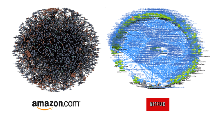 MSA와, Spring Cloud를 정리한 포스팅에서도 올려놨지만 위 그림은 amazon과 nefilx의 아키텍처 애플리케이션들의 마이크로 서비스 간 종속성을 나타낸 그래프이다.