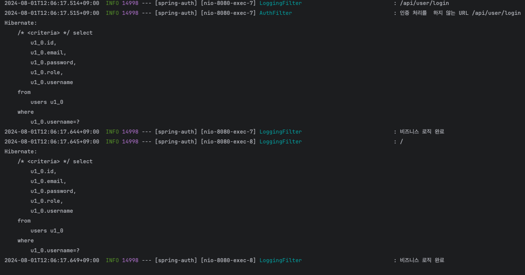 - AuthFilter가 요청에 대해 인증을 수행하며, 사용자 정보를 확인하기 위해 데이터베이스 쿼리를 실행합니다.