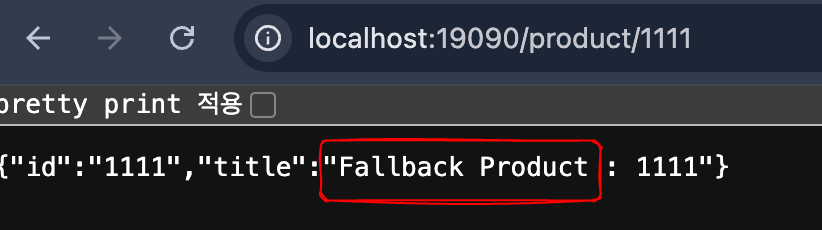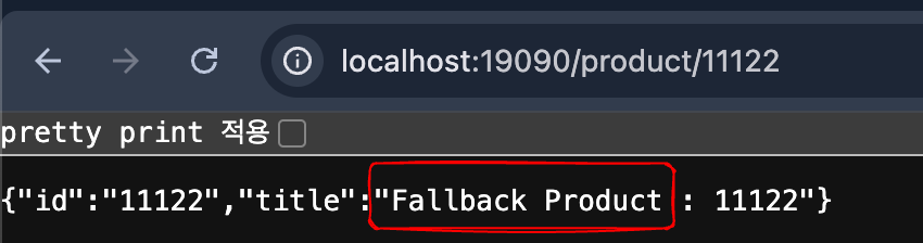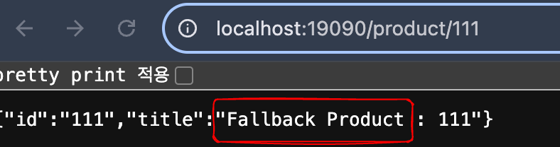 - localhost:19090/product/111 호출 시 Fallback 메서드를 호출하여 "Fallback Product"라는 문자열이 반환된 것을 확인할 수 있습니다.