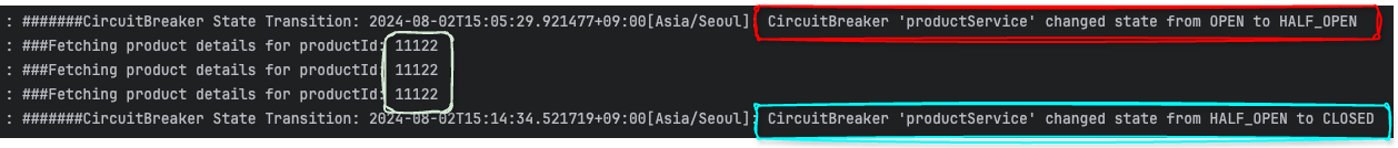 이 상태에서는 몇 개의 요청만을 테스트하여 서비스가 복구되었는지 확인합니다. 만약 테스트 요청(id = "11122")이 성공하면 서킷 브레이커는 다시 "CLOSED" 상태로 돌아가고, 실패하면 "OPEN" 상태로 돌아갑니다.