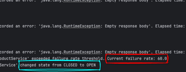 서킷브레이커의 로그를 확인하기 위해서 서비스 파일에다가 코드를 추가했습니다.
