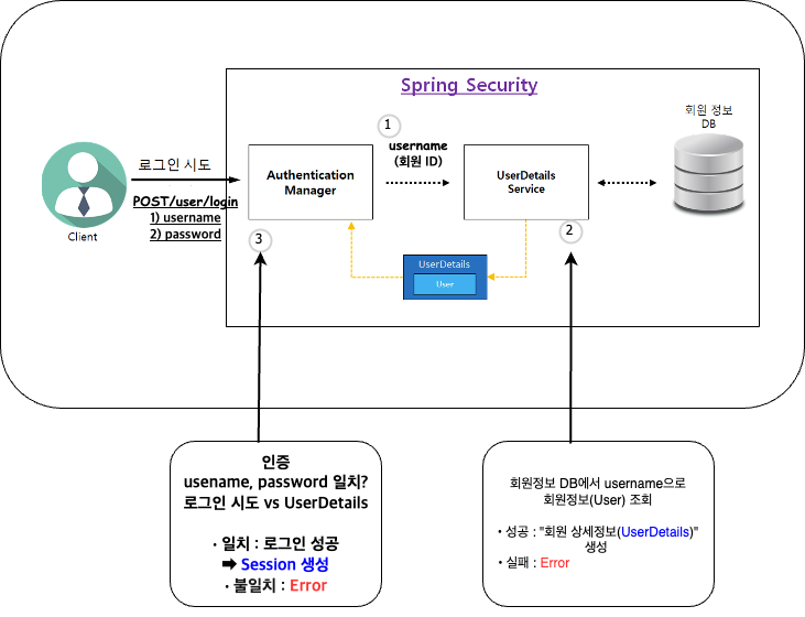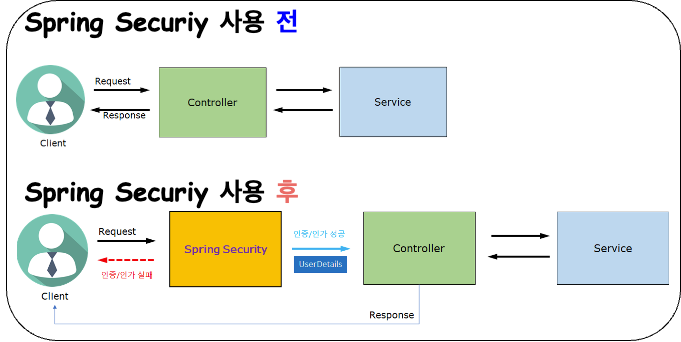 그러나 Spring Security를 사용하게 되면 앞단에 Spring Security의 AuthenticationManager를 통해 인증처리를 담당합니다.