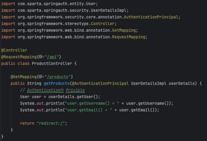 - 스프링 시큐리티가 Authentication 객체에서 Principal을 추출하고, 이를 매개변수로 주입합니다.