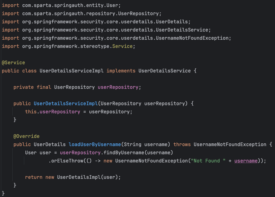 - 사용자 정보가 존재하면, UserDetailsImpl 객체를 생성하여 반환합니다.