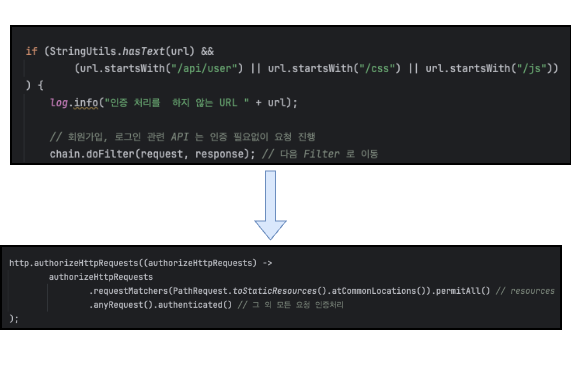url.startsWith("/api/user")와 같은 방식으로URL을 필터링하지 않아도 됩니다. - 대신, requestMatchers("/api/user/**"). permitAll()을 사용하여 /api/user로 시작하는 모든 요청을 간단히 허용할 수 있습니다.