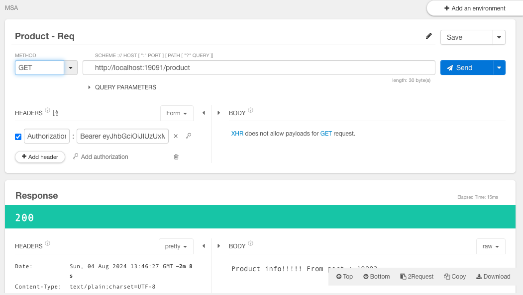 로그인 요청으로 발급받은 JWT 토큰을 Authorization 헤더에 포함시켜 http://localhost:19091/product 엔드포인트를 호출합니다.