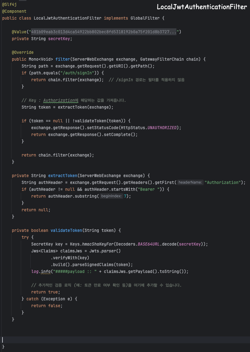 위 코드는 Spring Cloud Gateway에서 JWT Secret Key를 사용하여 인증을 처리하는 GlobalFilter를 구현한 것입니다.