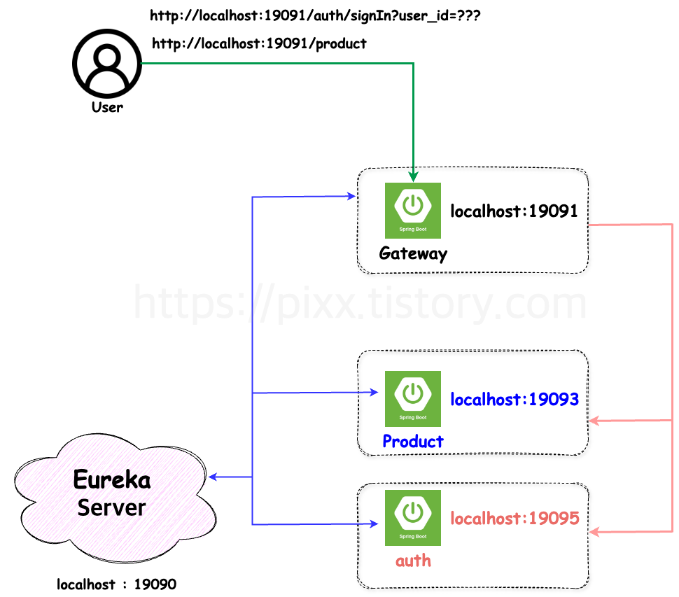 19091/auth/signIn?user_id=aaa 경로로 API Gateway(포트 19091)를 통해 접속하면, 요청이 정상적으로 auth 서버로 전달되어 로그인이 성공적으로 이루어지는 것을 확인할 수 있습니다.