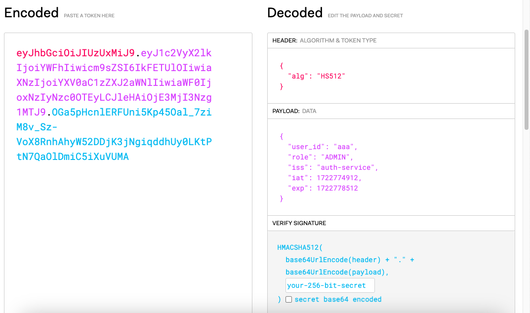 발급받은 토큰을 jwt.io에 들어가서 넣어서 payload를 확인해보면 user_id와 role이 aaa,ADMIN으로 정상적으로 나옵니다.