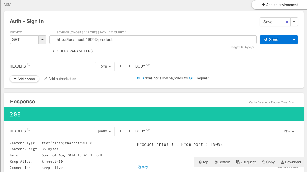 이 호출은 API Gateway를 통해 전달되며, product 서비스(포트 93번)로 요청이 정상적으로 호출되는 것을 확인할 수 있습니다.