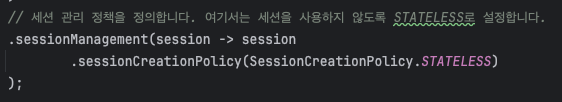 이 설정은 Spring Security의 웹 보안 구성에서 주로 사용되며, 클라이언트와 서버 간의 세션 관리 방식을 정의합니다.