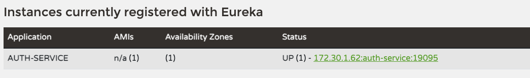 먼저 Eureka 서버를 실행시키고 "localhost:19090"에 접속을 해보면 위와 같이 AUTH-SERVICE가 잘 연결된 것을 확인할 수 있습니다.