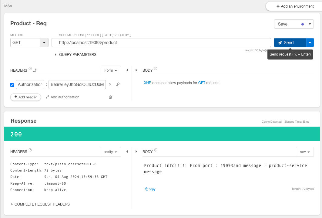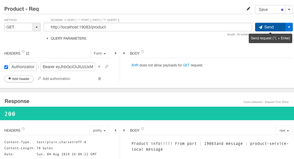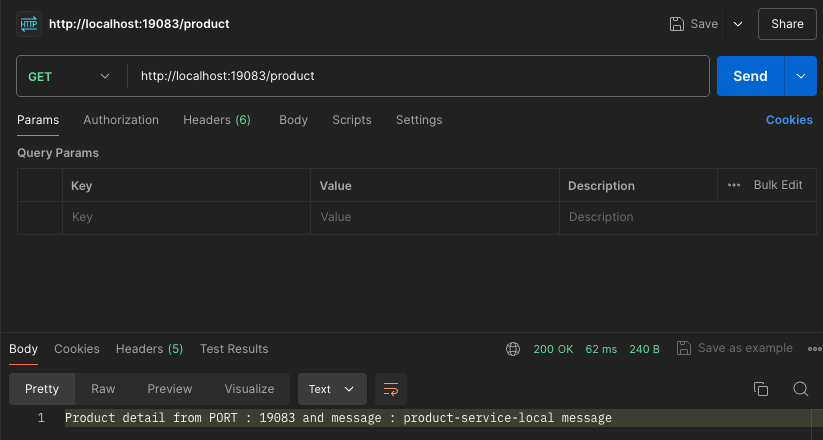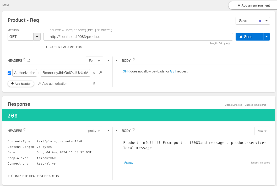 http://localhost:19083/product를 호출하면 PORT: 19083, message: product-service-local message가 반환됩니다.
