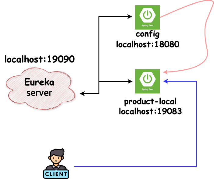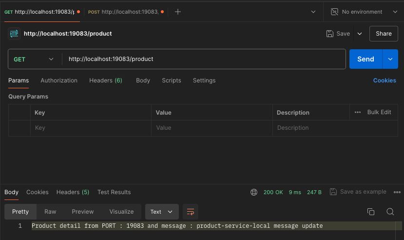 현재는 http://localhost:19083/product로 요청하면 포트 19083과 메시지 "product-service-local message"가 반환됩니다.