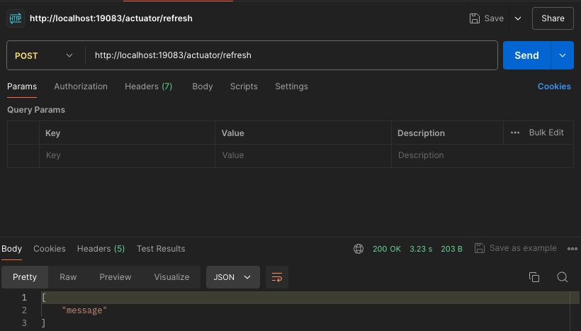 "http://localhost:19083/actuator/refresh"로 호출해 보면, 위와 같이 응답으로 message라는 키가 포함된 데이터를 확인할 수 있습니다. 이는 설정 파일의 메시지가 성공적으로 갱신되었음을 의미합니다.
