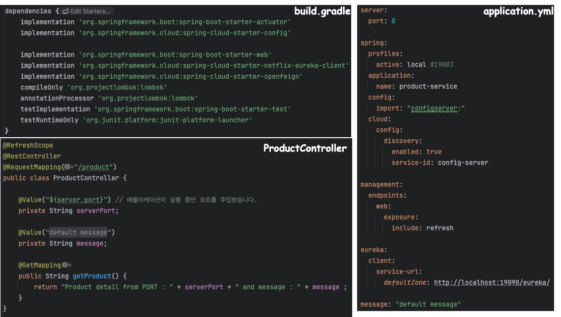 - ProductController에서 @RefreshScope 어노테이션을 사용하여 설정 변경 시 애플리케이션의 빈을 동적으로 갱신합니다.