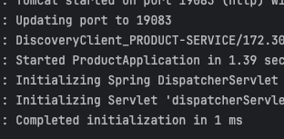 Product 서비스의 application.yml 파일에서는 server.port를 0으로 설정했지만, 실제로 서버를 실행해 보면 포트가 19083으로 할당된 것을 확인할 수 있습니다.