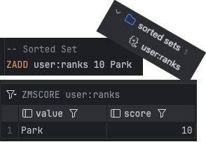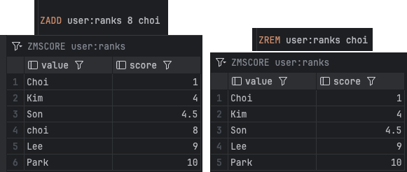 - 설명: 정렬된 집합에 하나 이상의 요소를 추가하거나 업데이트합니다. 요소는 점수와 함께 저장됩니다.
