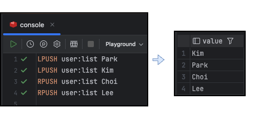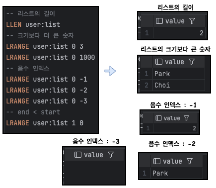 위 코드의 경우 0 -3 명령어를 실행하면, 0부터 -3까지의 범위를 조회합니다. -3은 리스트의 끝에서 세 번째 요소를 의미하지만, 현재 리스트는 [Park, Choi]로 2개의 요소만 포함되어 있기 때문에 -3번째 요소는 존재하지 않습니다. 따라서 범위가 유효하지 않아 결과는 빈 리스트가 됩니다.