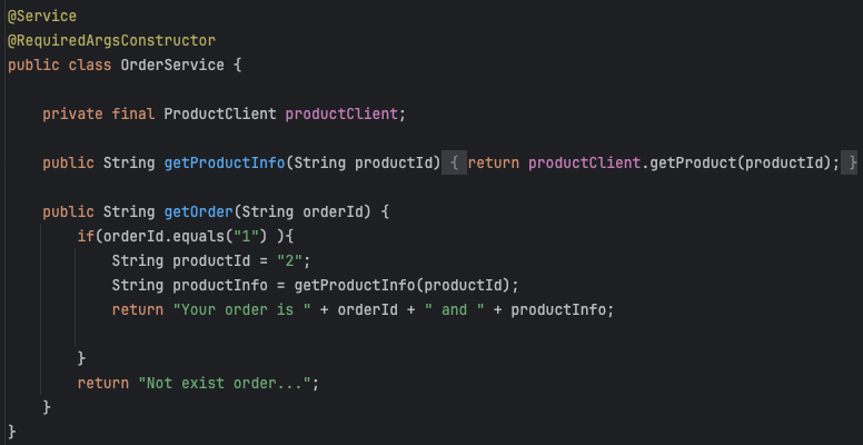 orderId를 통해 Order 서비스를 호출하고, orderId가 1일 경우 Product 서비스를 호출하여 제품 정보를 가져오는 간단한 프로젝트입니다.
