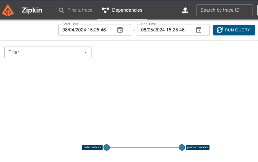 또한, 위 그림과 같이 Zipkin의 Dependencies 탭을 통해, 서비스 간의 호출 관계를 시각적으로 확인할 수 있습니다. 이 탭에서는 각 서비스가 서로를 호출하는 방식과 호출 경로를 한눈에 볼 수 있으며, 서비스 간의 의존성을 파악할 수 있습니다.