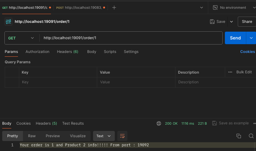 ORDER-SERVICE의 "http://localhost:19091/order/1"로 요청을 하면 ProductApp까지 정상적으로 호출해서 가져온 것을 볼 수 있습니다.
