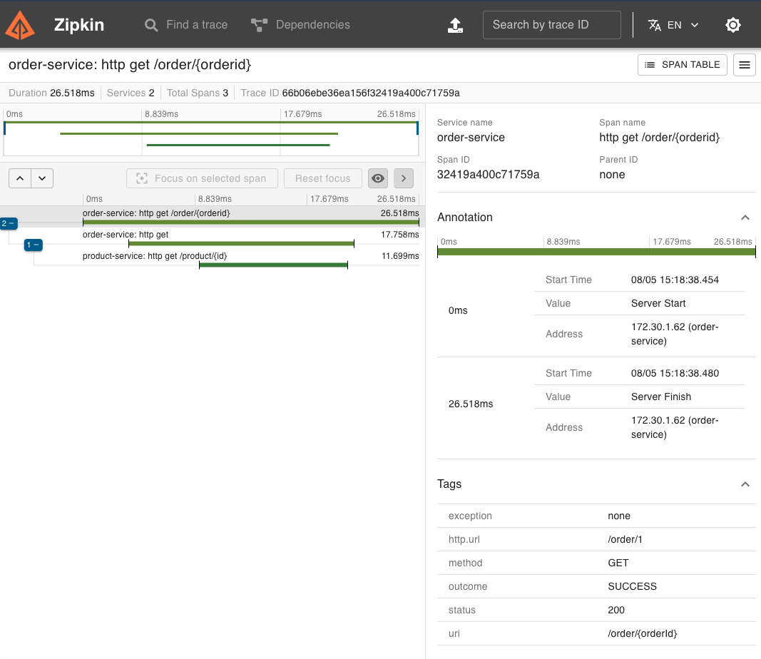 Zipkin UI에서 order-service의 HTTP GET /order/{orderId} 요청을 확인해보면, 요청 흐름이 어떻게 전개되는지를 시각적으로 알 수 있습니다.