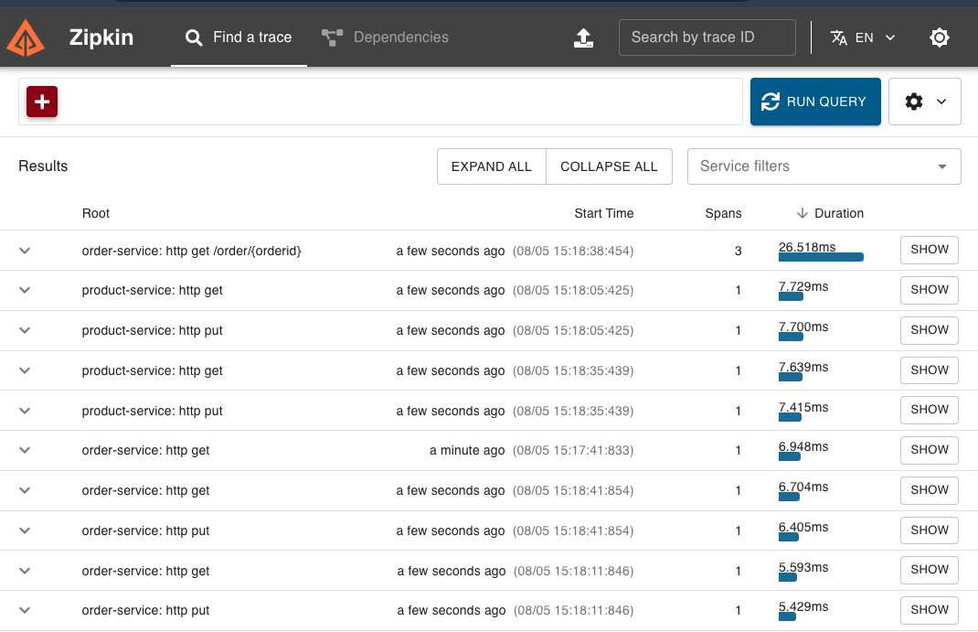 "localhost:9411"에 접속하여 이제 Zipkin을 RUN QUREY눌러 확인을 해보면, Result에 데이터가 생겼습니다.