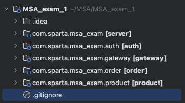 현재 프로젝트 구조는 위와 같이 MSA_exam_1라는 폴더 아래에 형성되어 있습니다.