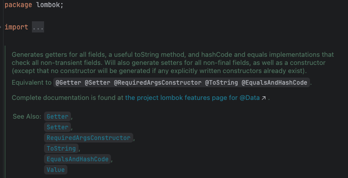 위와 같은 클래스를 정의하면, lombok은 자동으로 다음과 같은 메서드를 생성합니다.
