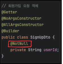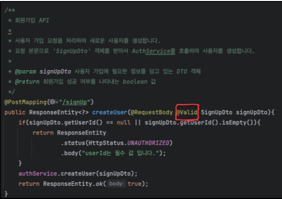 - @Valid 어노테이션을 메서드 파라미터에 추가하면, Spring이 해당 파라미터로 전달된 객체(SignUpDto)에 대해 유효성 검사를 수행합니다.