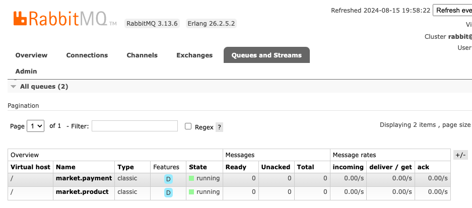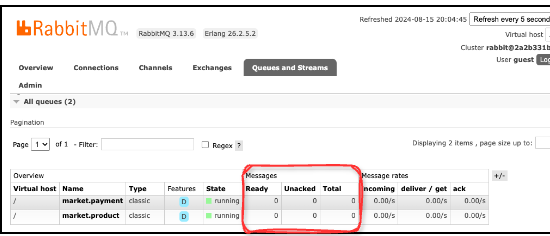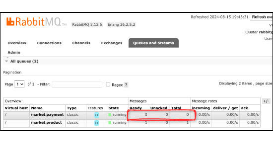 RabbitMQ 관리자 페이지의 Queues and Streams 섹션에서 확인하면, 원래 market.payment 큐에 적재되어 있던 메시지의 수가 1에서 0으로 변경된 것을 볼 수 있습니다.
