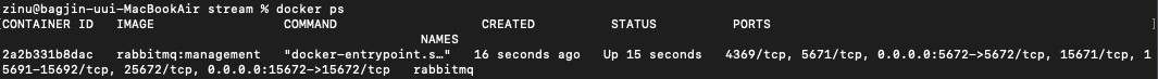 실행 후 "docker ps" 명령어로 현재 실행 중인 Docker 컨테이너의 목록을 보면 위와 같이 정상적으로 rabbitmq:management 이미지의 컨테이너가 실행 중입니다.