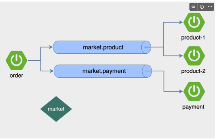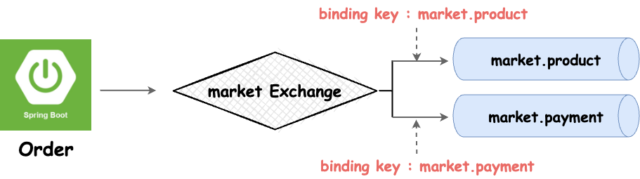 - RabbitMQ에서 메시지를 라우팅 할 교환기(Exchange)의 이름을 market으로 설정합니다.
