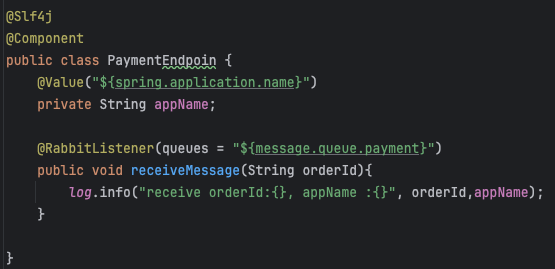 PaymentEndpoin 클래스는 RabbitMQ에서 수신한 메시지를 처리하는 컨슈머 컴포넌트를 구현하고 있습니다. 이 클래스는 Spring의 메시지 리스너를 사용하여 큐에서 메시지를 수신하고 로그를 출력합니다.