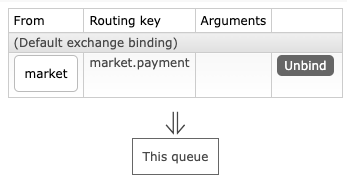 - 바인딩할 때 queuePayment 라우팅 키를 사용합니다. 본 글에서는 큐의 이름과 동일(market.payment)하게 지정했습니다.